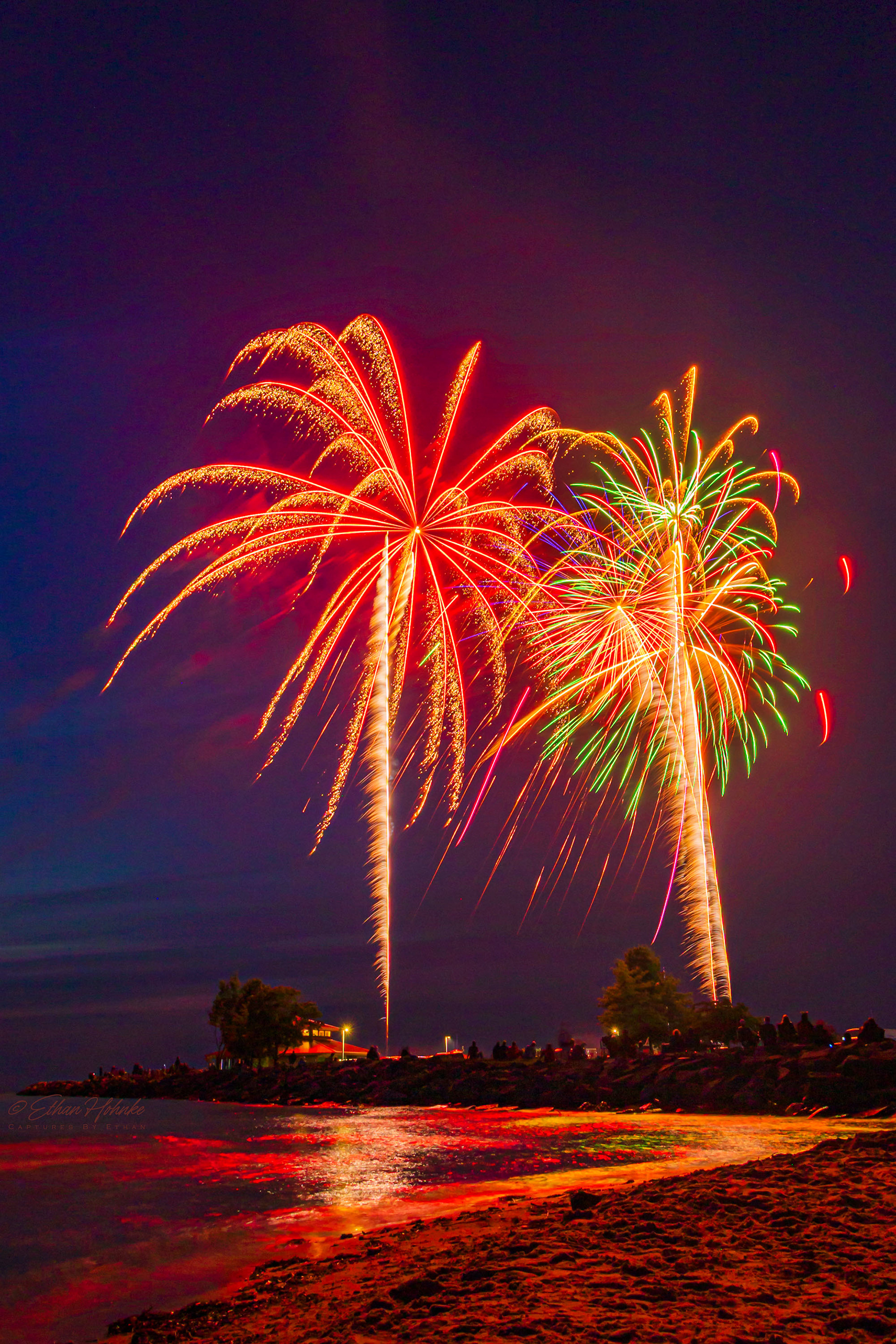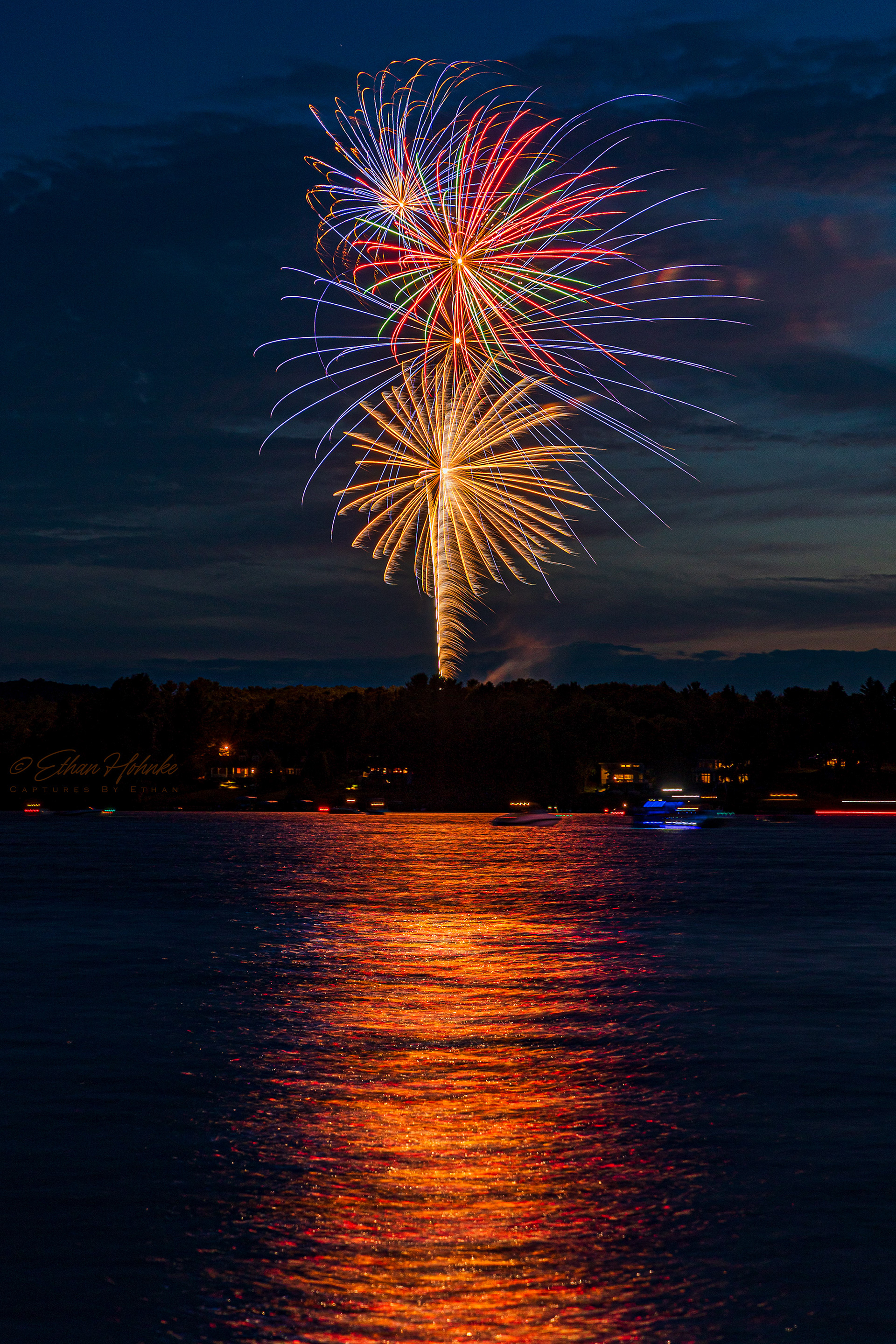 Leland 4th of July Fireworks over Lake Leelanau 2024 | Canon R6, Canon RF 24-105mm at 105mm, Benro tripod, wireless shutter remote | 8 second shutter speed, f/8, ISO 100