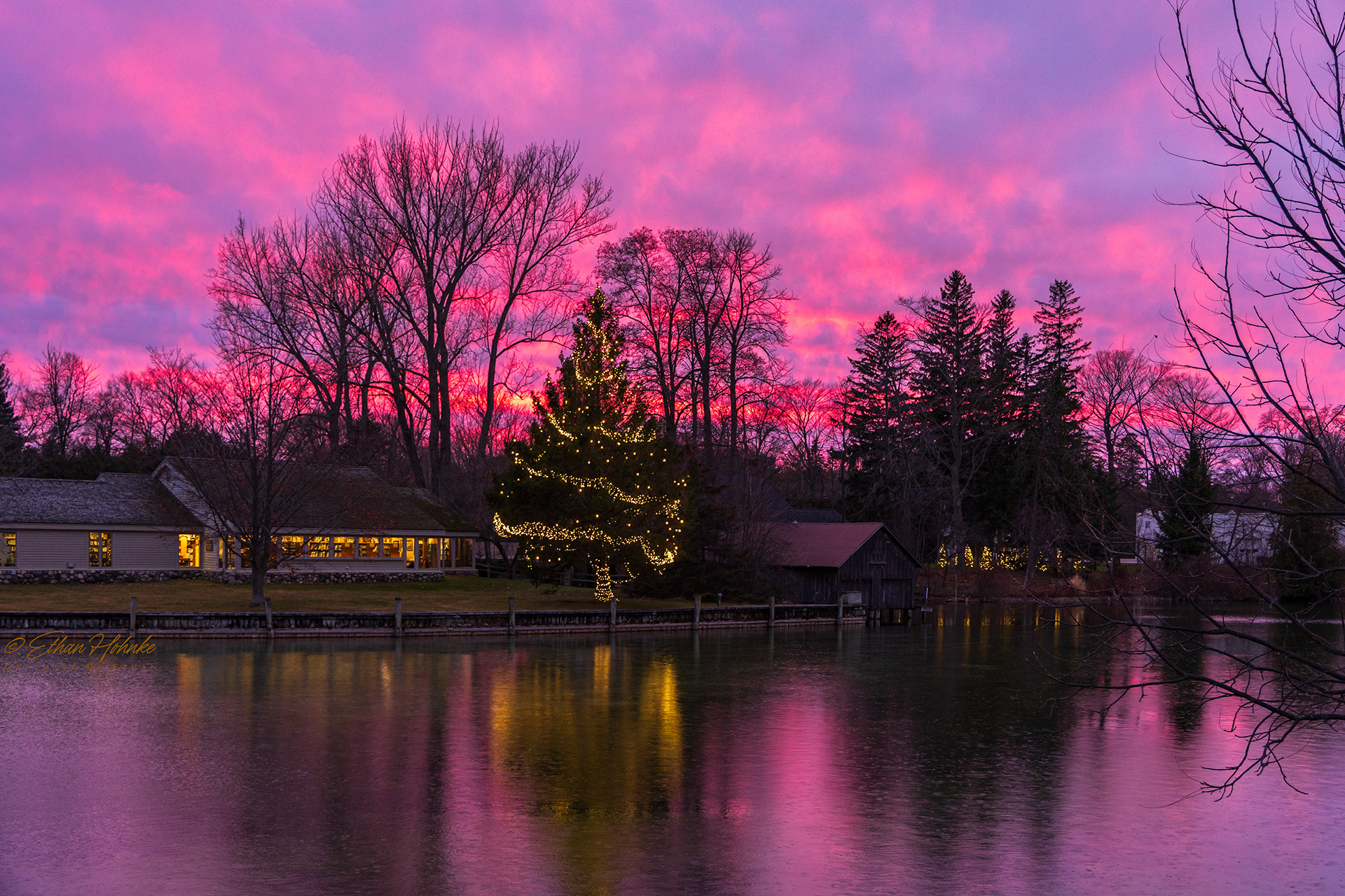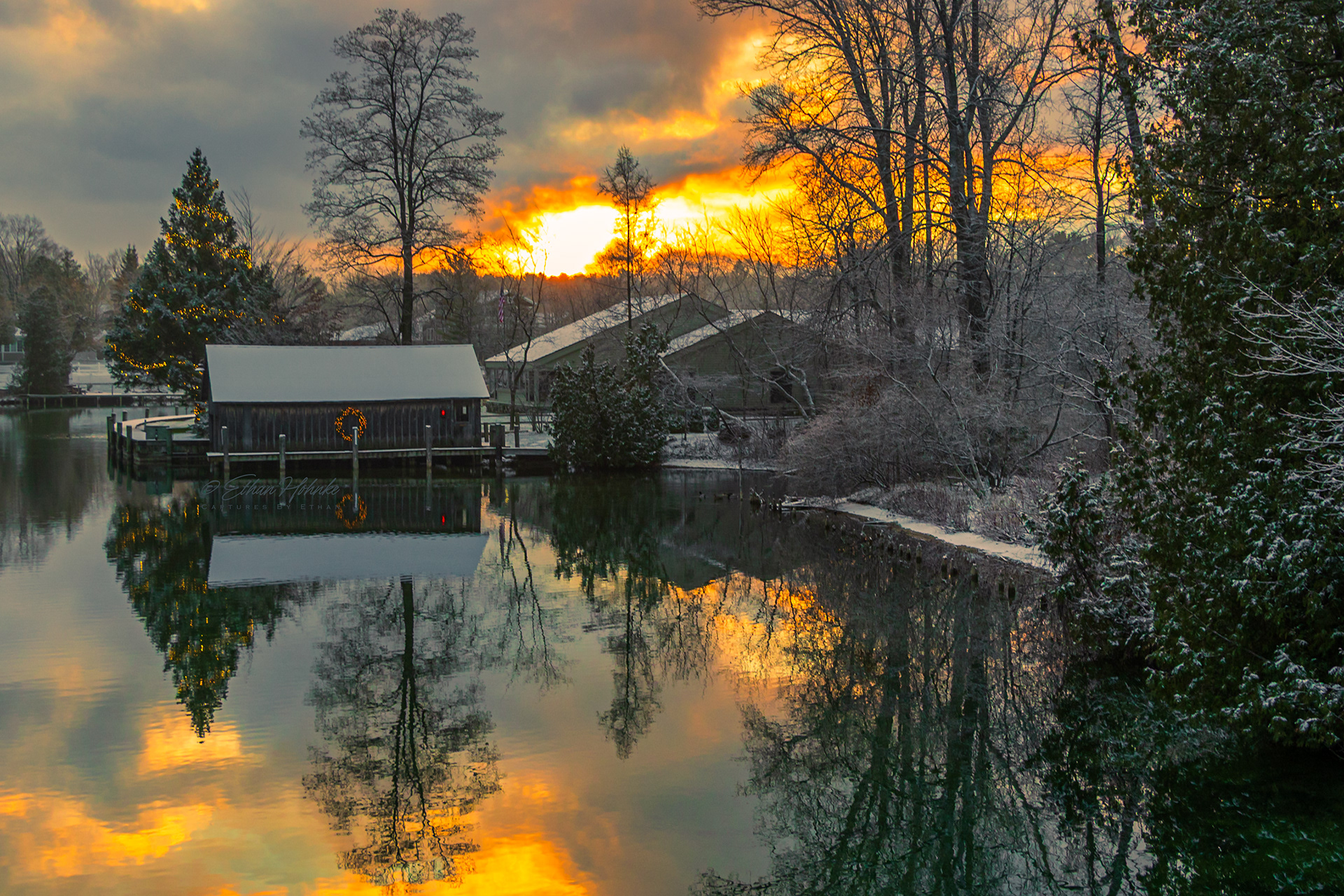 Christmas Time Burner Sunset over Leland River | December 27, 2023 | Canon R6, Canon RF 24-105mm at 39mm, Handheld | 1/80 second shutter speed, f/4.5, ISO 2000