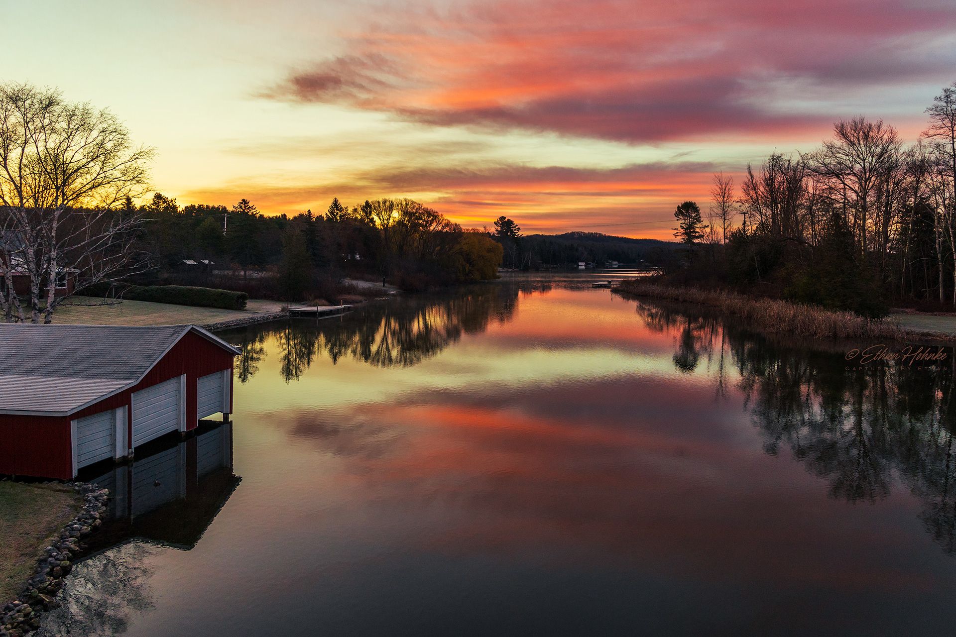Reflective Sunrise over the Leland River | September 20, 2022 | Canon R6, Canon EF 18-135mm at 18mm, Handheld | 1/80 second shutter speed, f/3.5, ISO 320