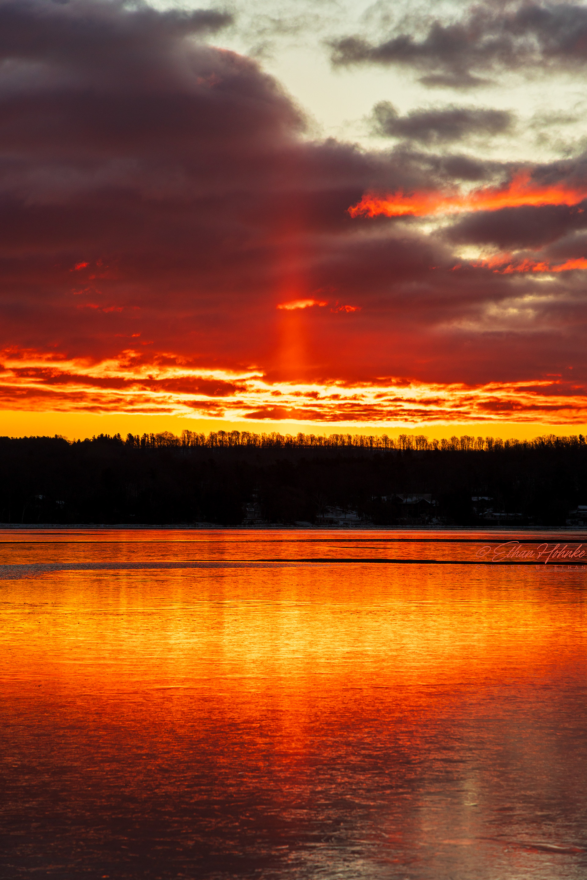 Sun Pillar Sunrise over Lake Leelanau | February 19, 2024 | Canon R6, Canon RF 24-105mm at 105mm, Benro tripod | 1/200 second shutter speed, f/7.1, ISO 320