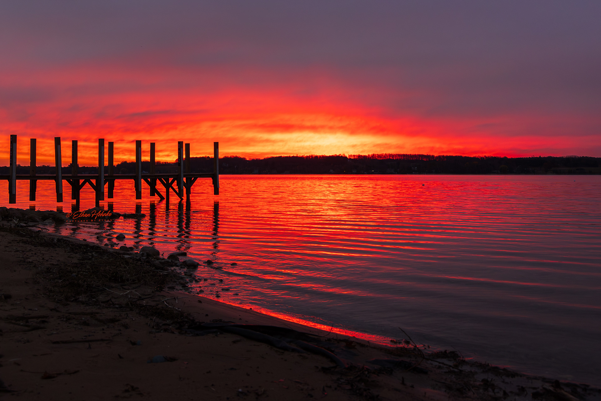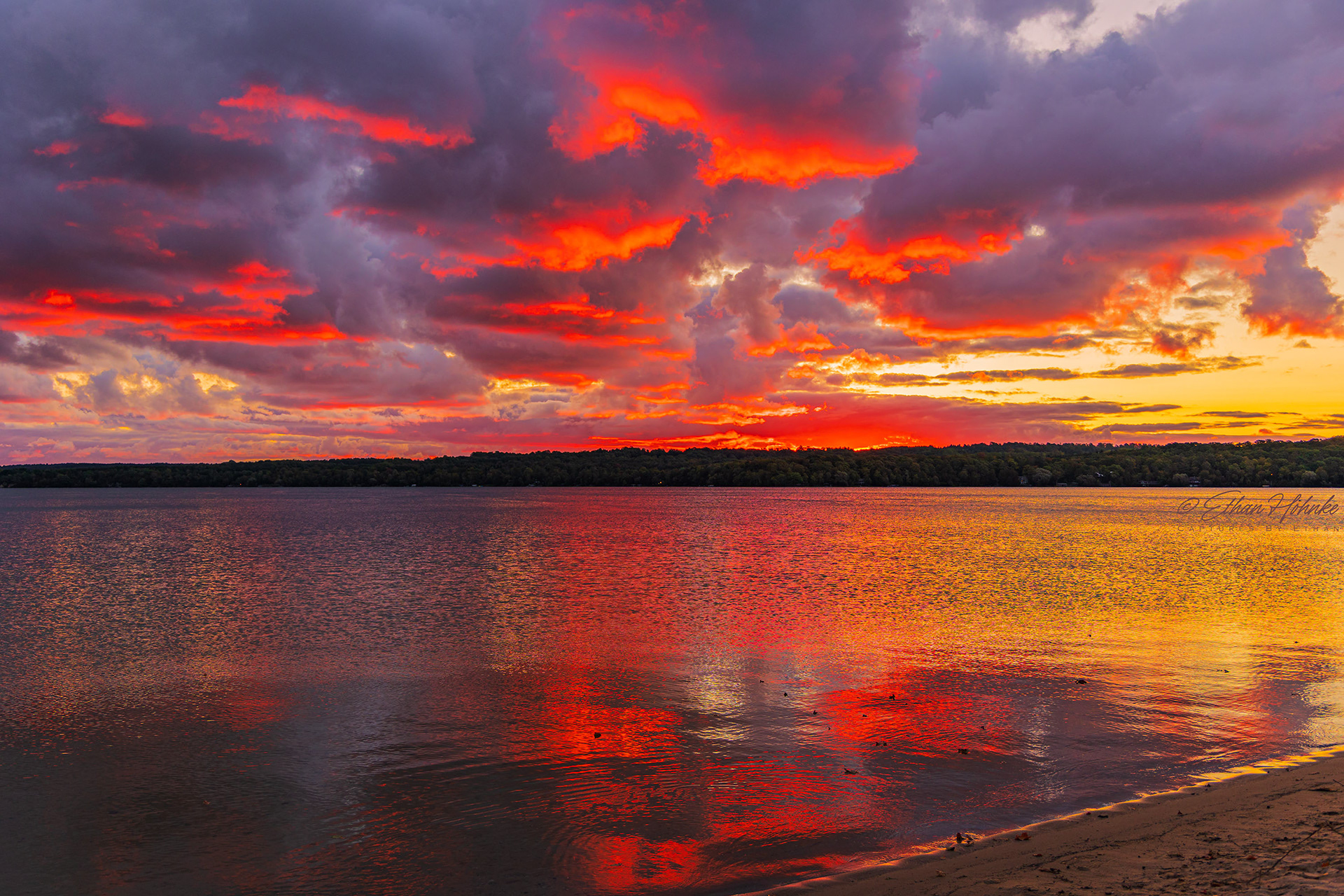 Fiery Fall Sunrise over Lake Leelanau | October 6, 2023 | Canon R6, Canon RF 24-105mm at 31mm, Benro tripod | 1/60 second shutter speed, f/4, ISO 100