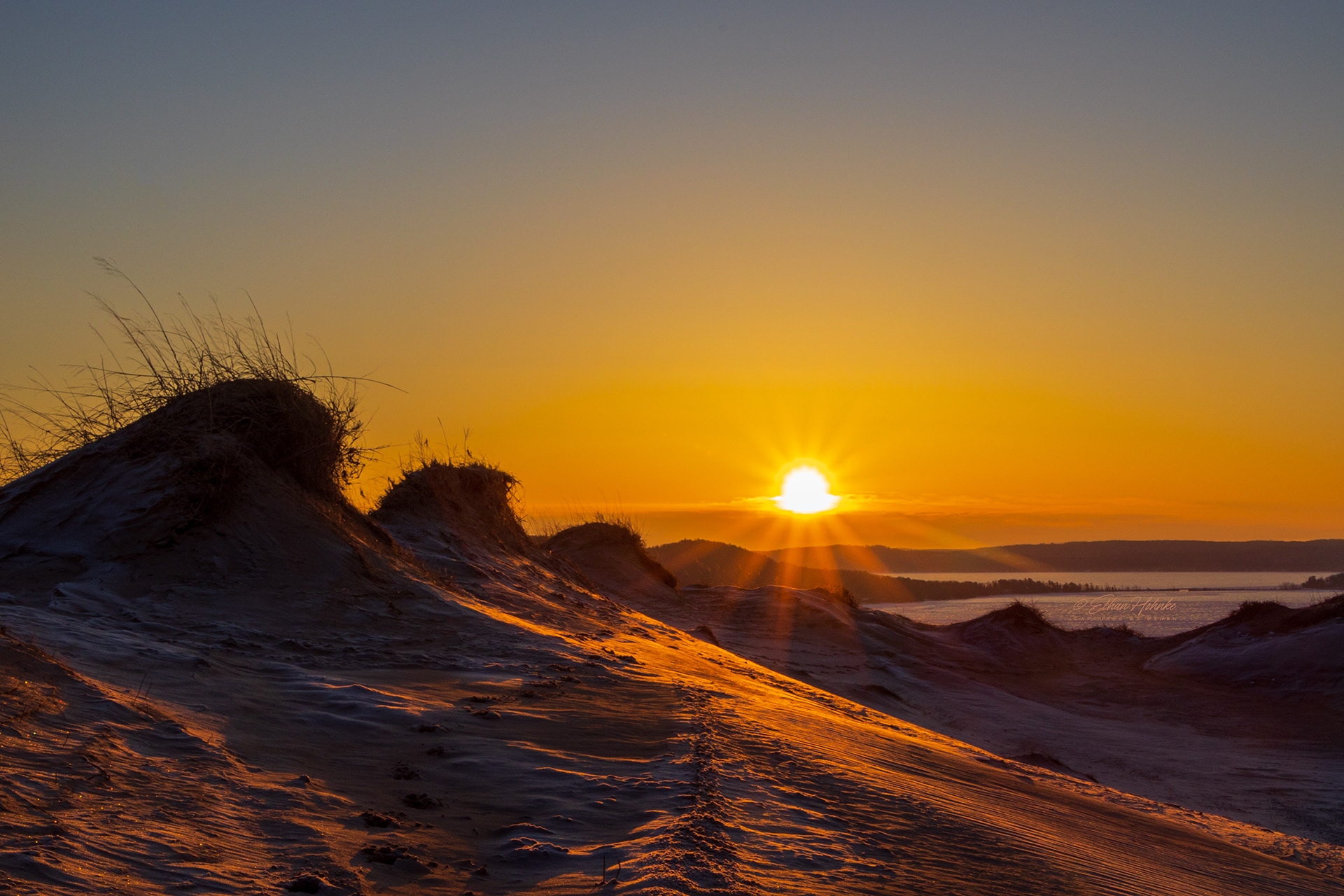 Golden Sunrise over the Sleeping Bear Dunes | March 4, 2023 | Canon R6, Canon EF 18-135mm at 35mm, Handheld | 1/125 second shutter speed, f/22, ISO 400