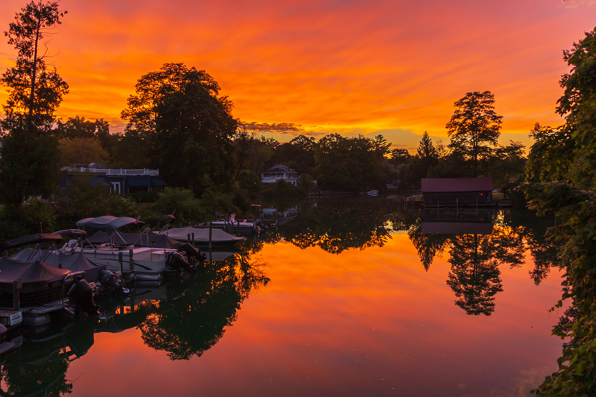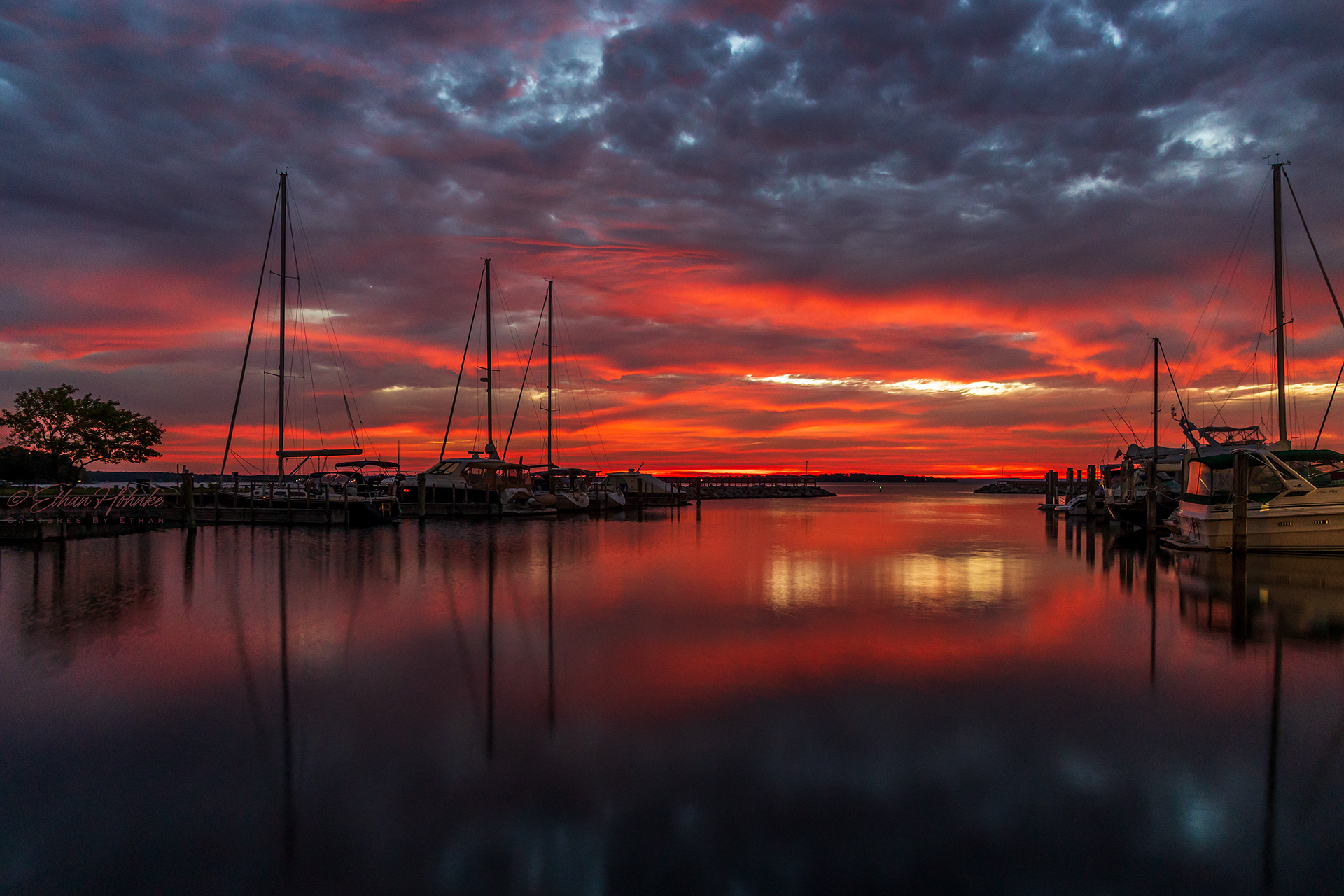 Fire Sunrise over Northport Marina | August 23, 2024 | Canon R6, Canon RF24-105mm at 24mm, Benro Tripod | 2 second shutter speed, f/8, ISO 2500