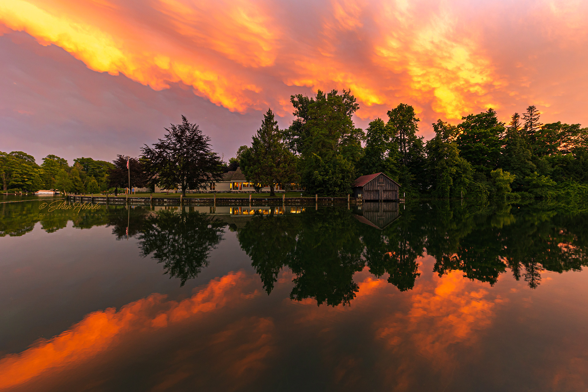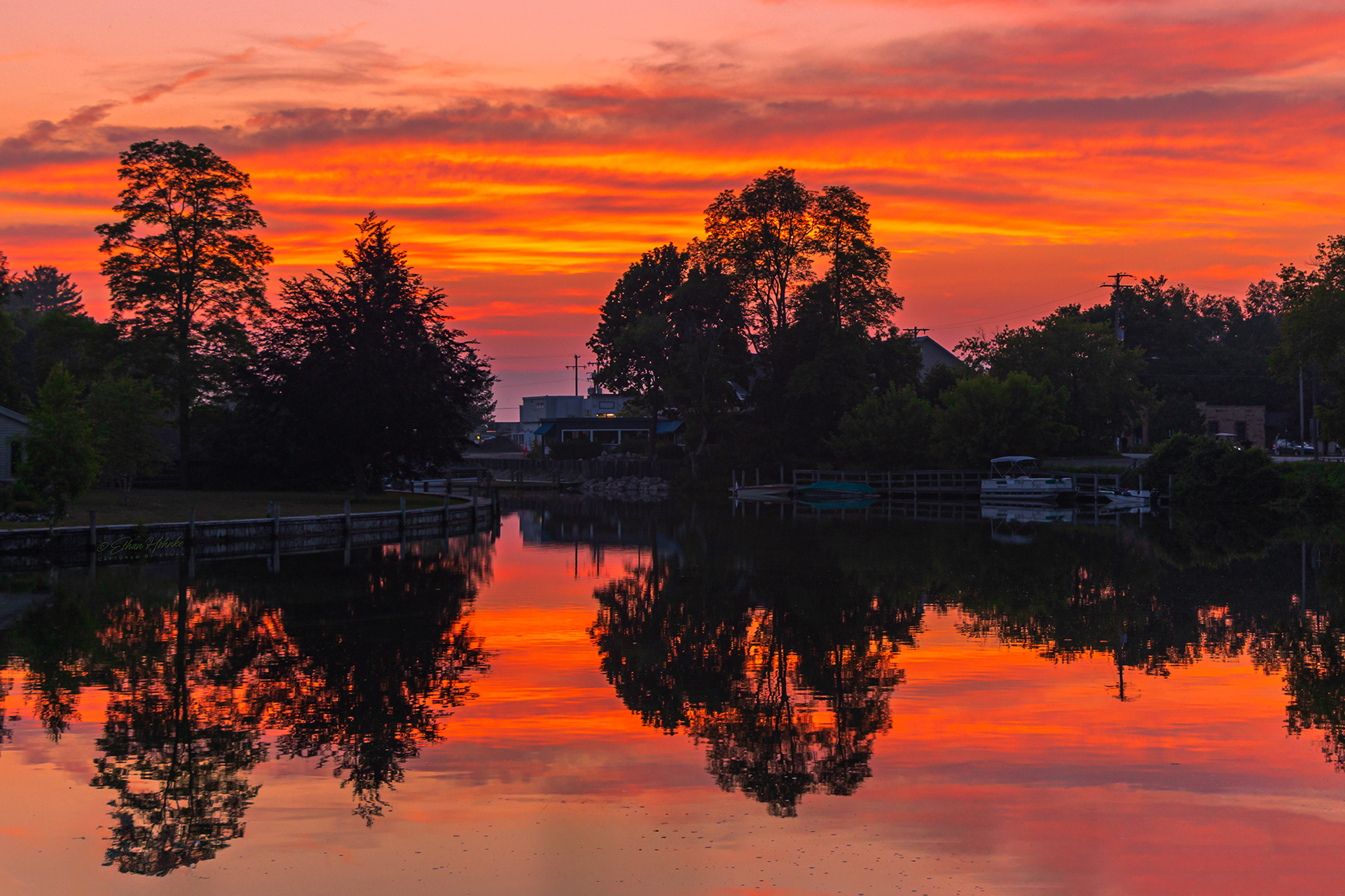 Sunset Reflection on the Leland River | July 1, 2023 | Canon R6, Canon EF 18-135mm at 35mm, Handheld | 1/125 second shutter speed, f/4.5, ISO 500