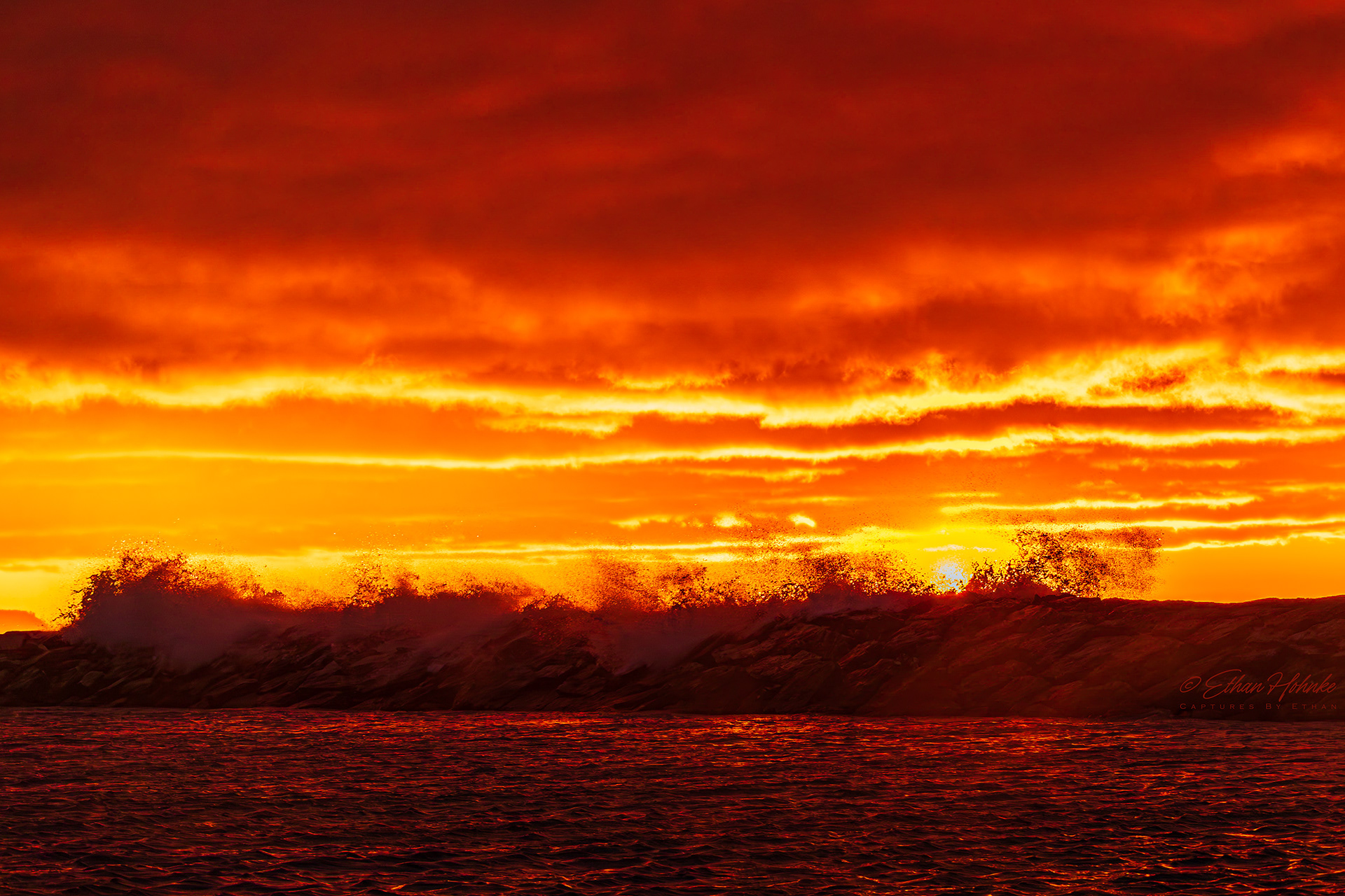 Waves Crash at Sunset - Leland | October 20, 2023 | Canon R6, Canon RF 100-400mm at 100mm, Handheld | 1/200 second shutter speed, f/5.6, ISO 320