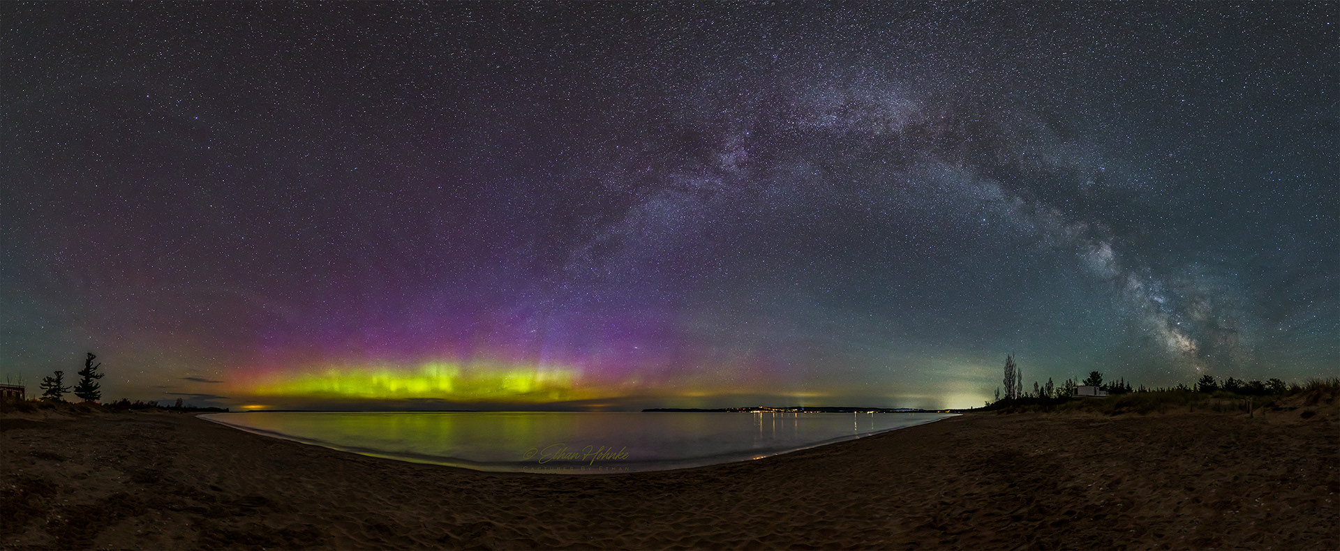 Milky Way Arch with Northern Lights from Glen Haven Panorama | 16 total images - Single Row | May 12, 2024 from 3:25am to 3:33am | Canon R6, adapted Sigma Art 14mm, Benro tripod | 5 second shutter speed, f/2, ISO 5000 | PTGui, Lightroom, Photoshop