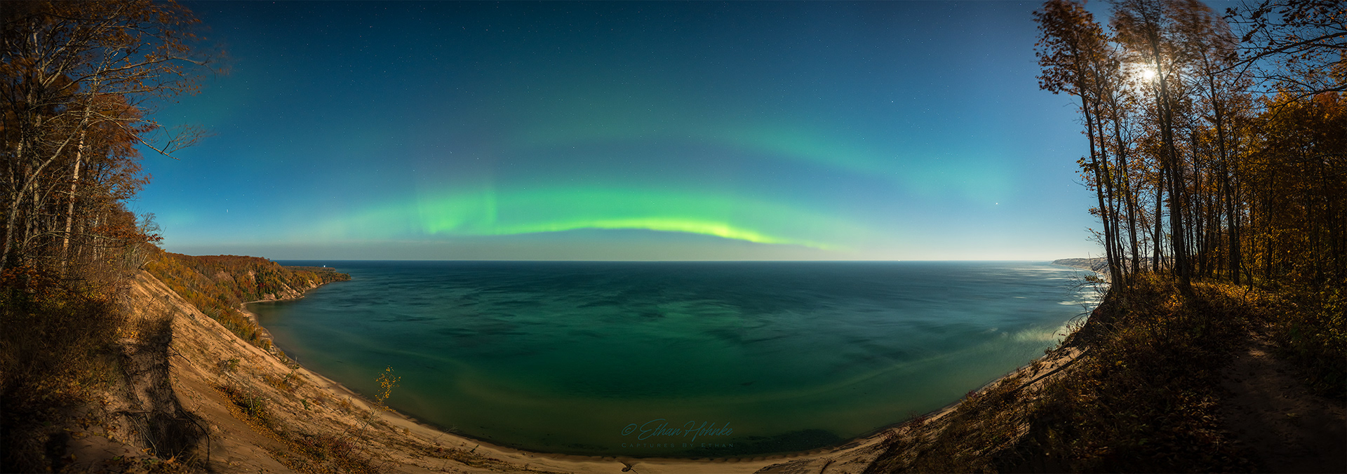Northern Lights over Lake Superior from Log Slide Overlook Panorama | 10 total images - Single Row | October 18, 2024 from 10:27pm to 10:30pm | Nikon Z8, Nikkor Z 20mm, Promaster Tripod | 5 second shutter speed, f/2.2, ISO 1600 | PTGui, Lightroom, Photoshop
