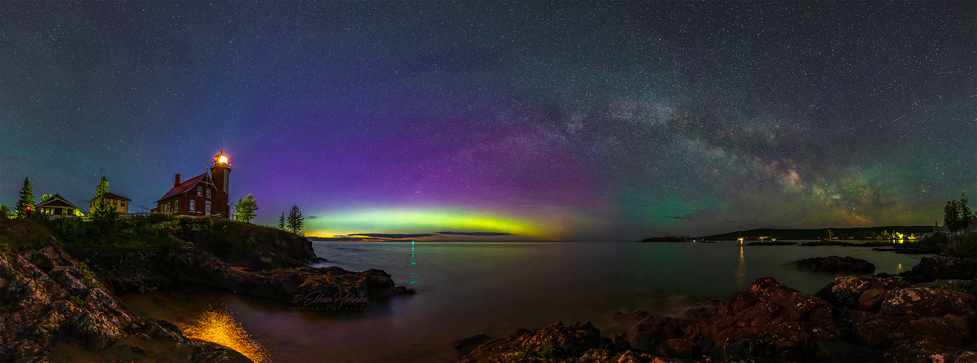 Milky Way Arch and Aurora from Eagle Harbor Lighthouse Panorama | 12 total images - Single Row | June 7-8, 2024 from 11:59pm to 12:05am | Canon R6, adapted Sigma Art 14mm, Benro tripod | 10 second shutter speed, f/2.2, ISO 3200 | PTGui, Lightroom, Photoshop