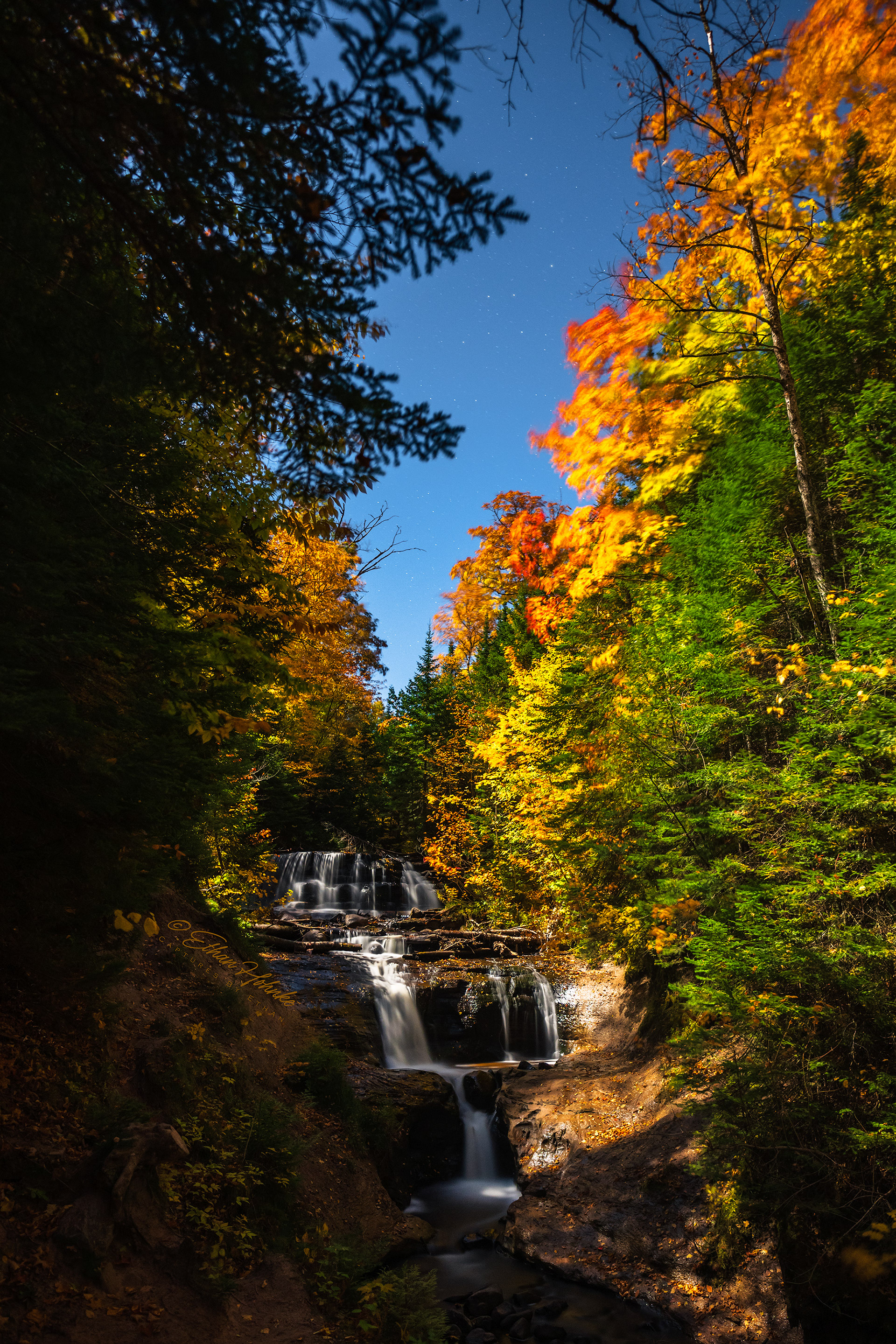 Sable Falls in Autumn Moonlight | October 19, 2024 at 12:58am | Nikon Z8, Nikkor Z 20mm, Promaster Tripod | 30 second shutter speed, f/2, ISO 1000